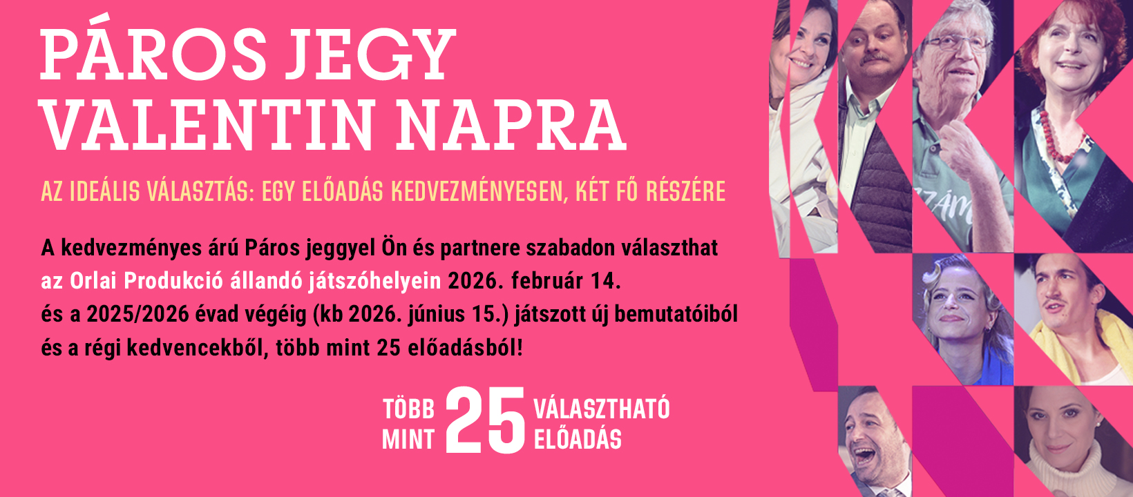 Válasszon szabadon az Orlai Produkció a Belvárosi Színházban és a 6színben 2025. szeptember 1. és 2025. december 23., valamint 2026. január 1. és 2026. június 15. között játszott új bemutatóiból és a régi kedvencekből, közel 20 előadásból!
